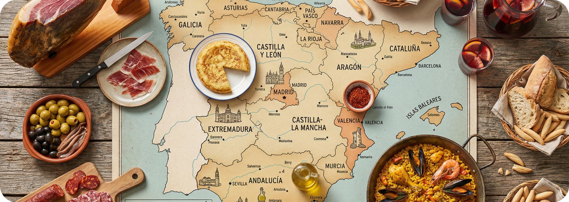 Španielska gastronómia je pestrá mozaika formovaná rozmanitou krajinou, klímou a stáročnými kultúrnymi vplyvmi. Od slnkom zaliatych olivových hájov na juhu cez zelené hory na severe až po súostrovia – každá zo 17 autonómnych oblastí krajiny má svoje vlastné typické jedlo. Tieto recepty zvýrazňujú miestne suroviny – čerstvé morské plody, mäso, ryžu, fazuľu a zeleninu – a rozprávajú príbeh regionálnej identity.