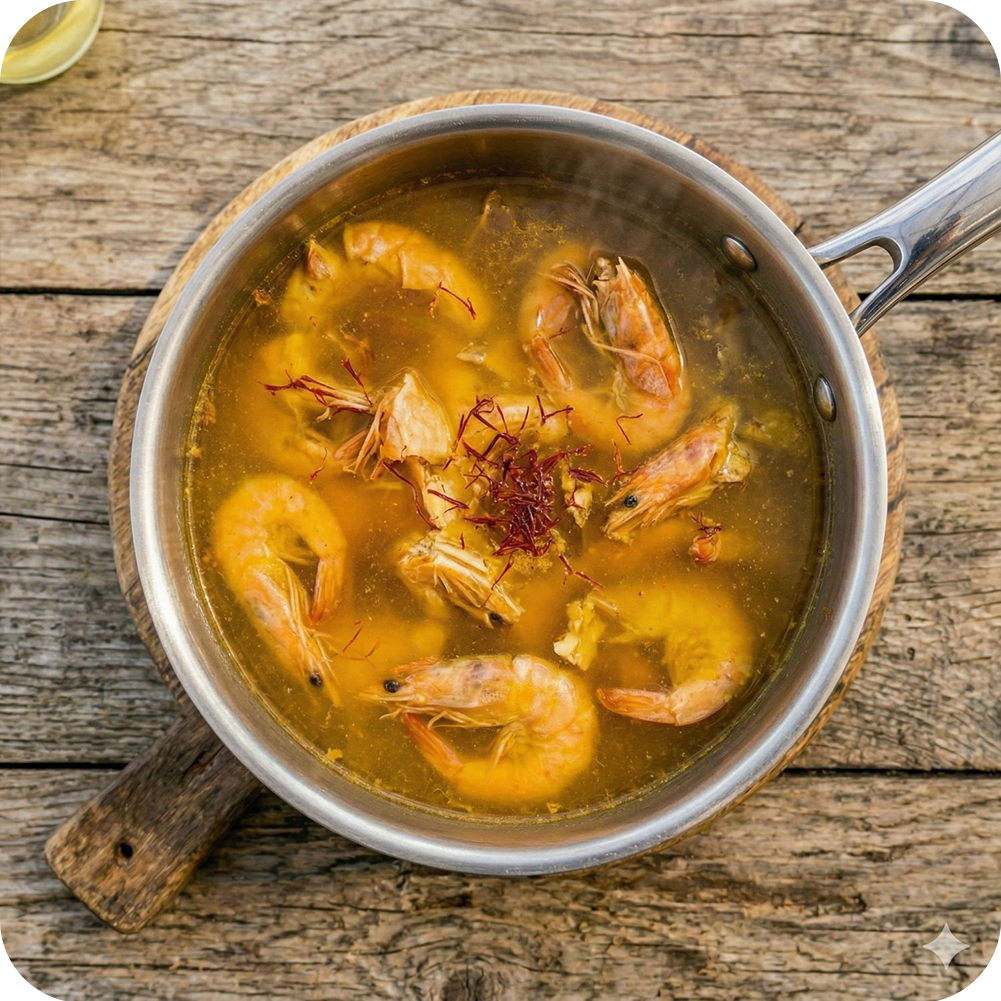 Tip: Ak máte škrupiny z kreviet, krátko ich opečte na 1–2 čajových lyžičkách oleja 1–2 minúty. Podlejte ich trochou vína/vývaru, povarte 5 minút a preceďte – vývar bude omnoho aromatickejší.)