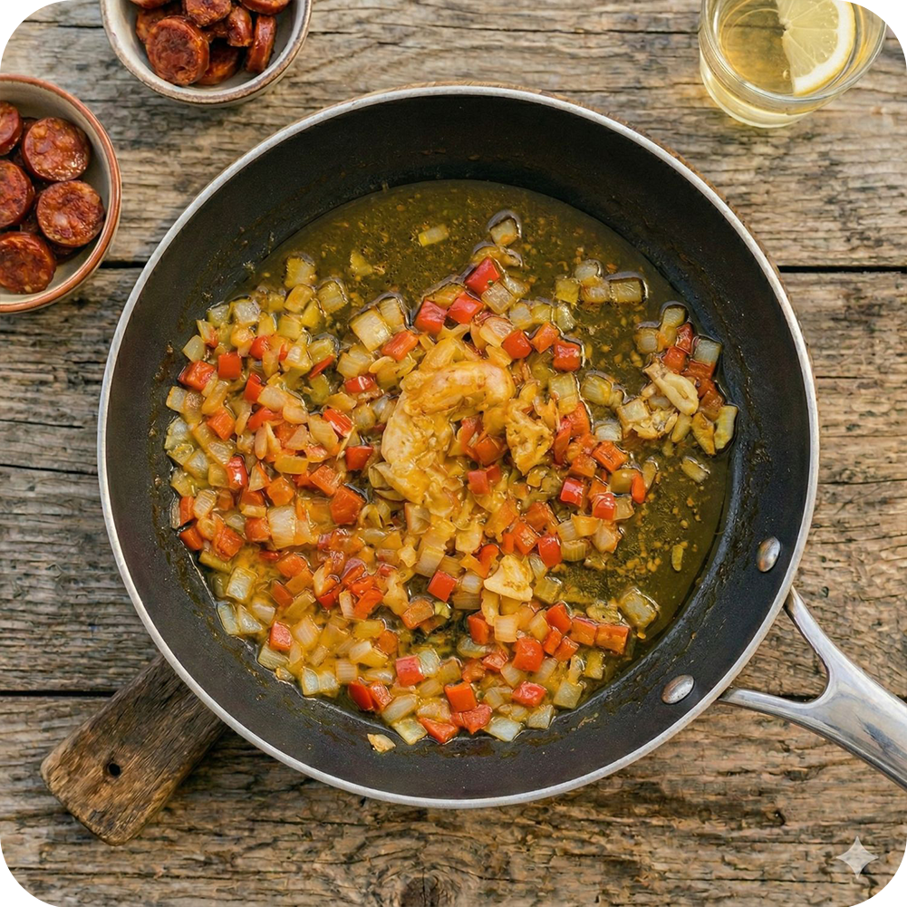 Ak používate chorizo, najprv opečte plátky 2–3 minúty, kým nepustia tuk a mierne nezačnú chrumkať → vyberte a odložte.